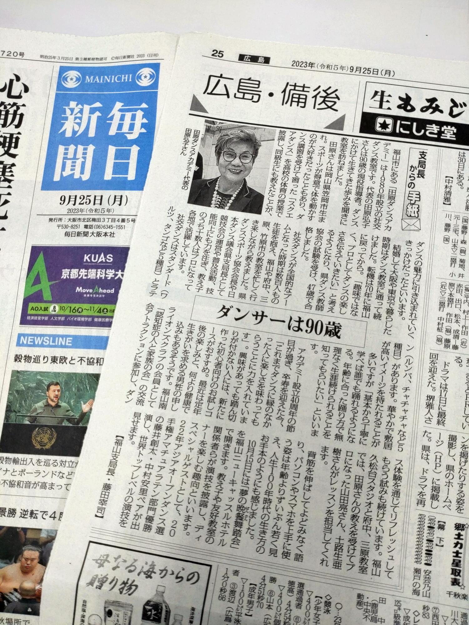 毎日新聞に掲載されました お知らせ 2023年09月25日 毎日新聞からの取材を受けました。 「人生100年時代のお手本のような生き方」 と記事を掲載していただいています。 コメントを残す コメントをキャンセルメールアドレスが公開されることはありません。 ※ が付いている欄は必須項目ですコメント ※ 名前 ※ メール ※ サイト 次回のコメントで使用するためブラウザーに自分の名前、メールアドレス、サイトを保存する。 第41回「夢の晩餐舞踏会」開催決定! 藤井創太・中村安里組との写真