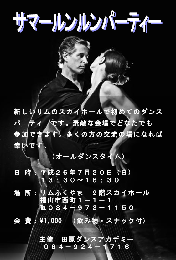 サマールンルンパーティー 社交ダンスパーティー 2014年06月11日 ダンスパーティーのお知らせ リムふくやまへのアクセスはこちら コメントを残す コメントをキャンセルメールアドレスが公開されることはありません。 ※ が付いている欄は必須項目ですコメント ※ 名前 ※ メール ※ サイト 次回のコメントで使用するためブラウザーに自分の名前、メールアドレス、サイトを保存する。 武田 邦彦 先生 広島県ダンススポーツ協会会員講習会のお知らせ